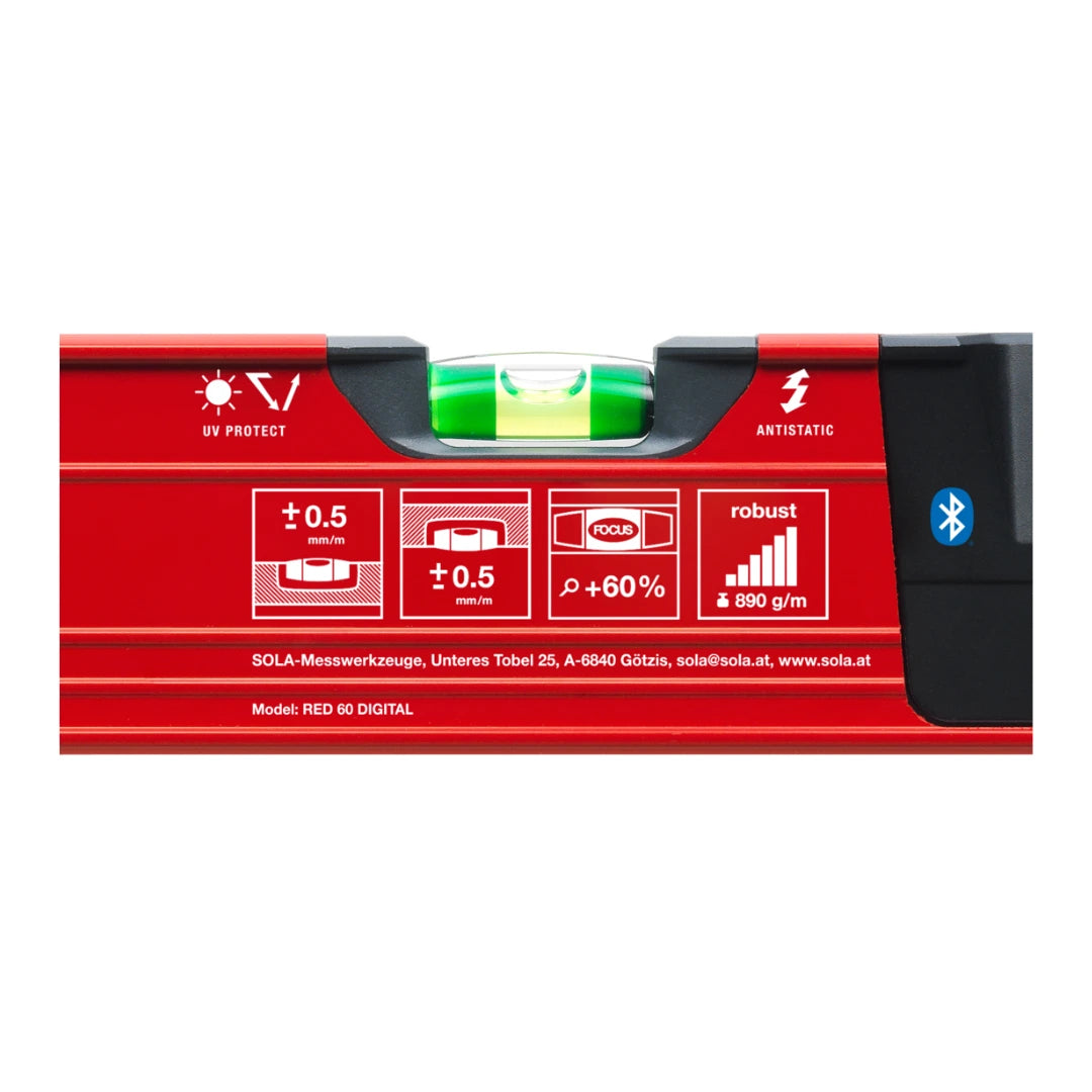 Boloboc digital profesional SOLA RED, din aluminiu rezistent, cu măsurători exacte pe orizontală, verticală și unghiuri, modul Solatronic și conectivitate Bluetooth.