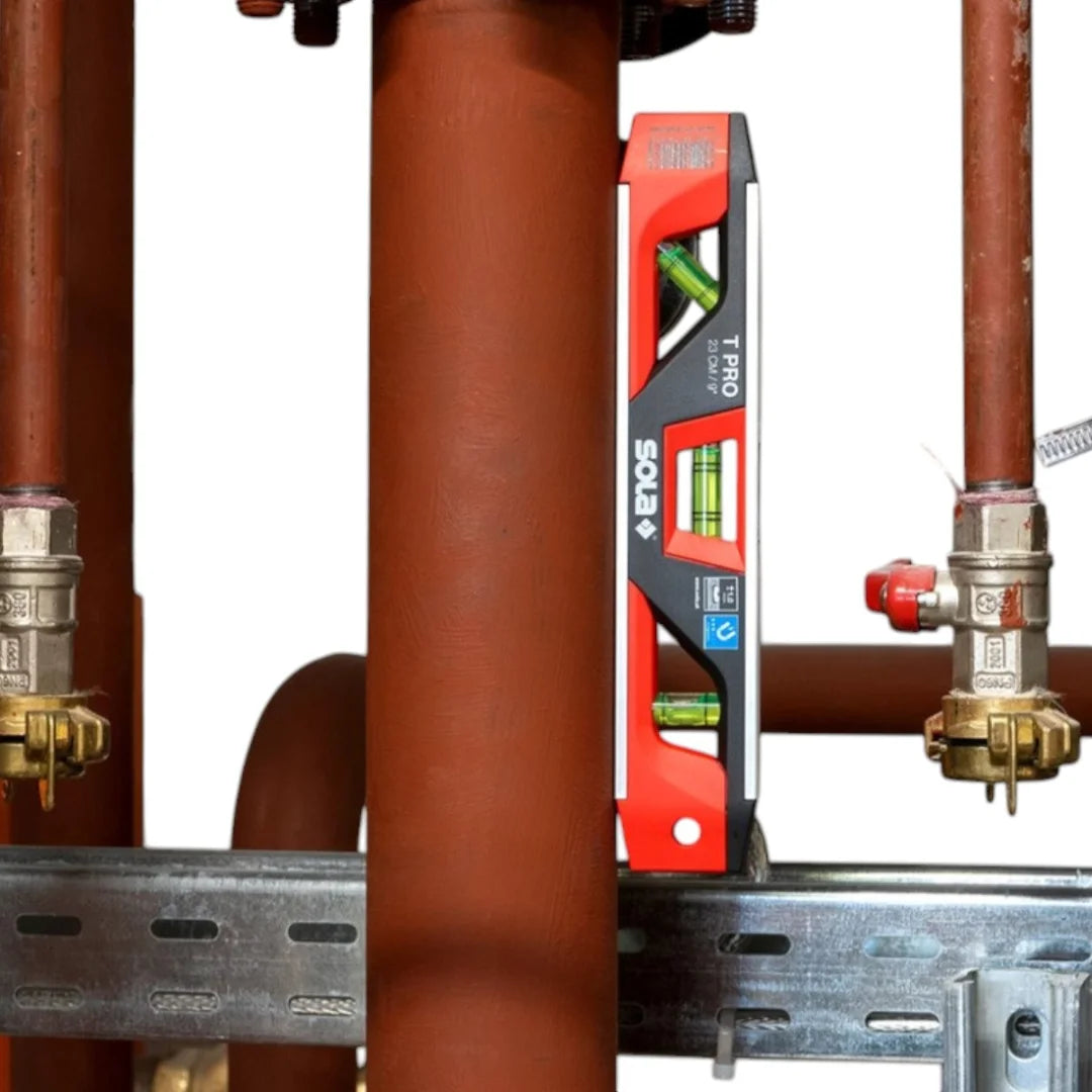 Datorită benzii magnetice puternice, acest Boloboc Plastic SOLA T PRO se fixează ferm pe suprafețe metalice, iar canalul în formă de V permite poziționarea stabilă pe țevi. Bulele sunt mari, ultra-vizibile, iar ferestrele generoase facilitează citirea în orice condiții de lucru. Modelul include trei bule de nivel – orizontală, verticală și la 45° – acoperind toate situațiile de măsurare. Bula centrală are 4 marcaje, cu diferență de 2% între ele, ideală pentru pantă sau aliniere fină.
