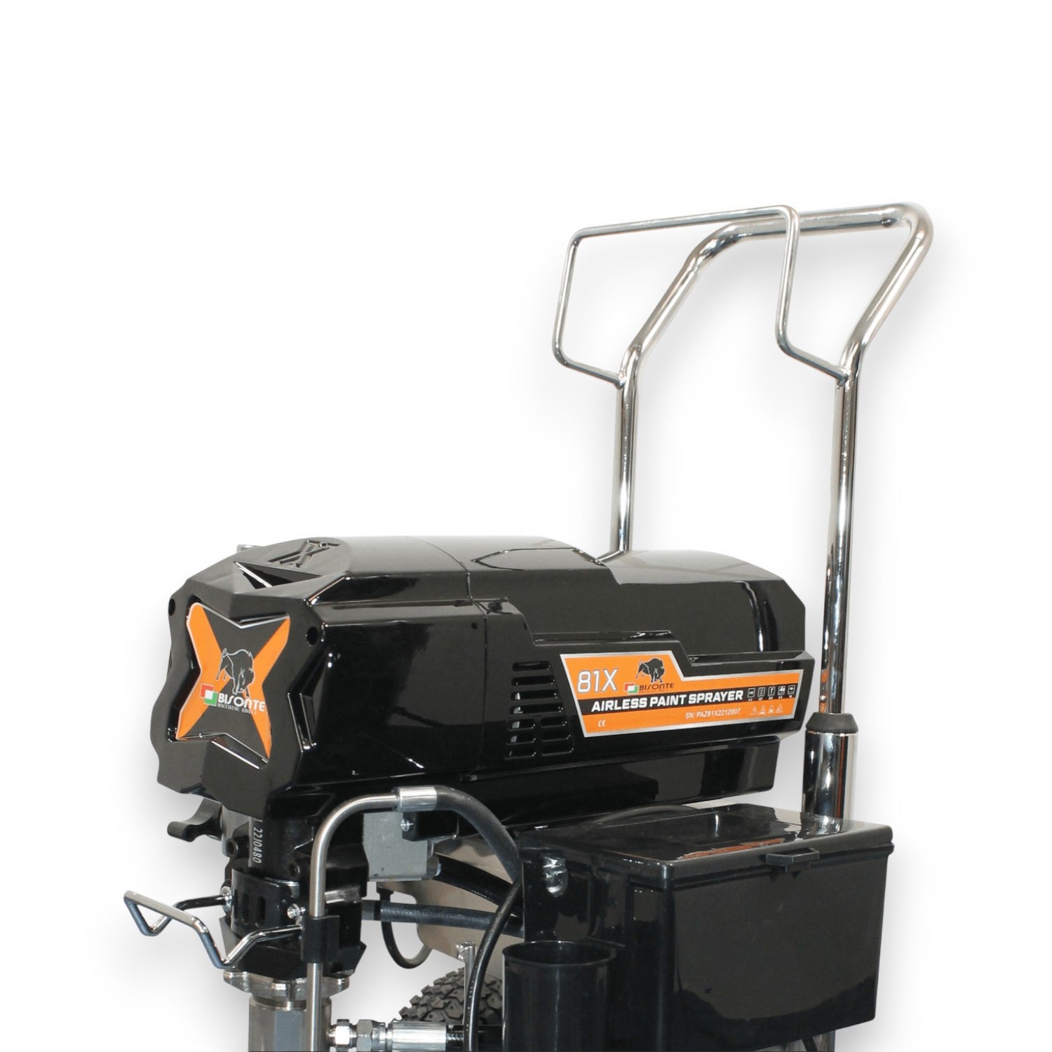 Pompa airless profesionala cu piston si motor fara perii, ideala pentru aplicatii intensive de zugravit si vopsit. Poate functiona cu 2 pistoale simultan. Ofera randament ridicat si precizie in aplicare. Cadru robust, roti pneumatice si maner cu suport pentru furtun. Compatibila cu vopsele pe baza de apa sau ulei.