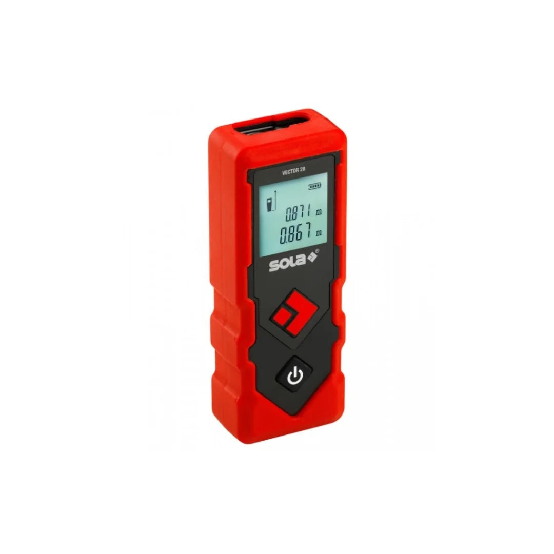 Telemetru SOLA VECTOR 20 — instrument de măsurare laser compact cu display iluminat, carcasă soft-grip și autonomie până la 5000 măsurători. Funcție de măsurare continuă. Alimentare 2 × AAA.