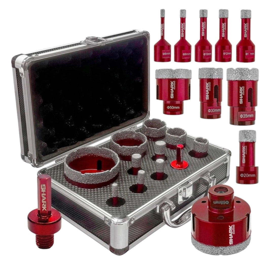 Set profesional SHARK de 10 carote diamantate M14, realizate prin tehnologie vacuum brazed, pentru găurire rapidă și precisă în materiale dure precum gresie, granit și marmură.